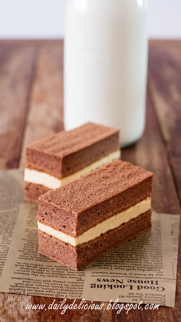 This soft cake is very easy to make, but the trickiest thing that you have to be careful with is when baking it. Because this kind of cake contains a lot of liquid (this time I use water and Non-dairy half creamer, but you can use whipping cream instead of the Non-dairy half creamer ), the result is the soft and moist texture. But you have to bake it right, don't be tempted by the look and smell, the cake will be fully cook when it spring back (press the cake and there will be no mark on the cake). Under-baked cake will be fallen and flat -*-, so be careful!