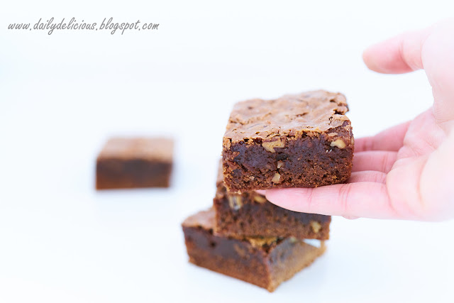 As this cake is very close to both of them, the making method is the same as the brownie, but you have less chocolate in the batter. The texture is very fudge, because it contain low quantity of flour ^^. You can make it more chocolately (but still being cake not brownie) by using chocolate with higher percentage of the cocoa mass.