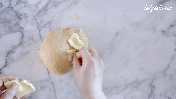 Put the butter into the dough.