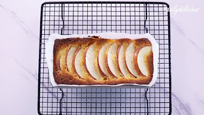 To make the cake more beautiful, we place half of the apple over the cake. But if you place it before the top of the cake becomes set, it will sink. So we bake the cake only for a short time, so your apple slices will be kept in place.